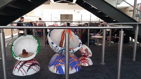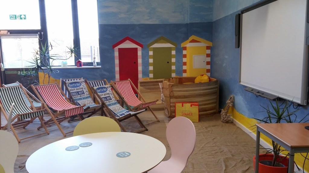 זה, אגב – חדר שבו מתקיימות פגישות צוות. אין בבי"ס חדר מורים ענק כמו שאנחנו מכירים מבתיה"ס שלנו, אלא מספר חדרי מורים קטנים באזורים שונים בביה"ס שבהם יש שולחן אישי ופינת עבודה אישית לכל מורה. את חדר חוף-הים הזה עיצבה וצבעה בעצמה סגנית המנהל: