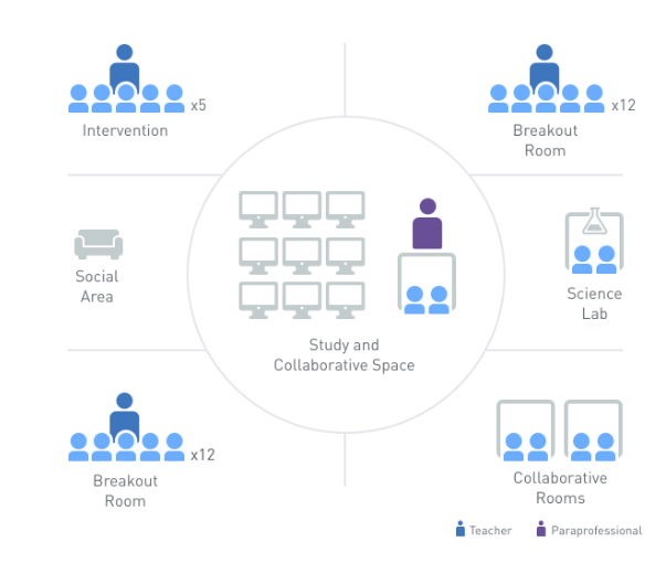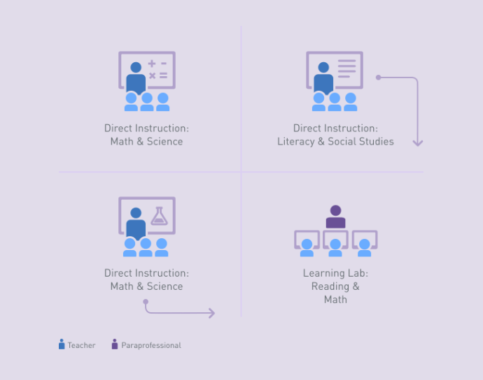 כלומר: התחנות עדיין קיימות כמו במודלים הקודמים, אבל לא כולם יבקרו בכל התחנות, ובוודאי שלא לאותם פרקי זמן. באותה משבצת, חלק מהתלמידים עשויים להימצא במפגש של הקניה ישירה עם מורה, חלק אחר בלמידה פרטנית בקבוצה קטנה, אחרים בעבודה עצמאית על פרויקט ועוד. במקביל יש כל הזמן משאבים ללמידה מקוונת שמשרתים את כל הנ"ל.