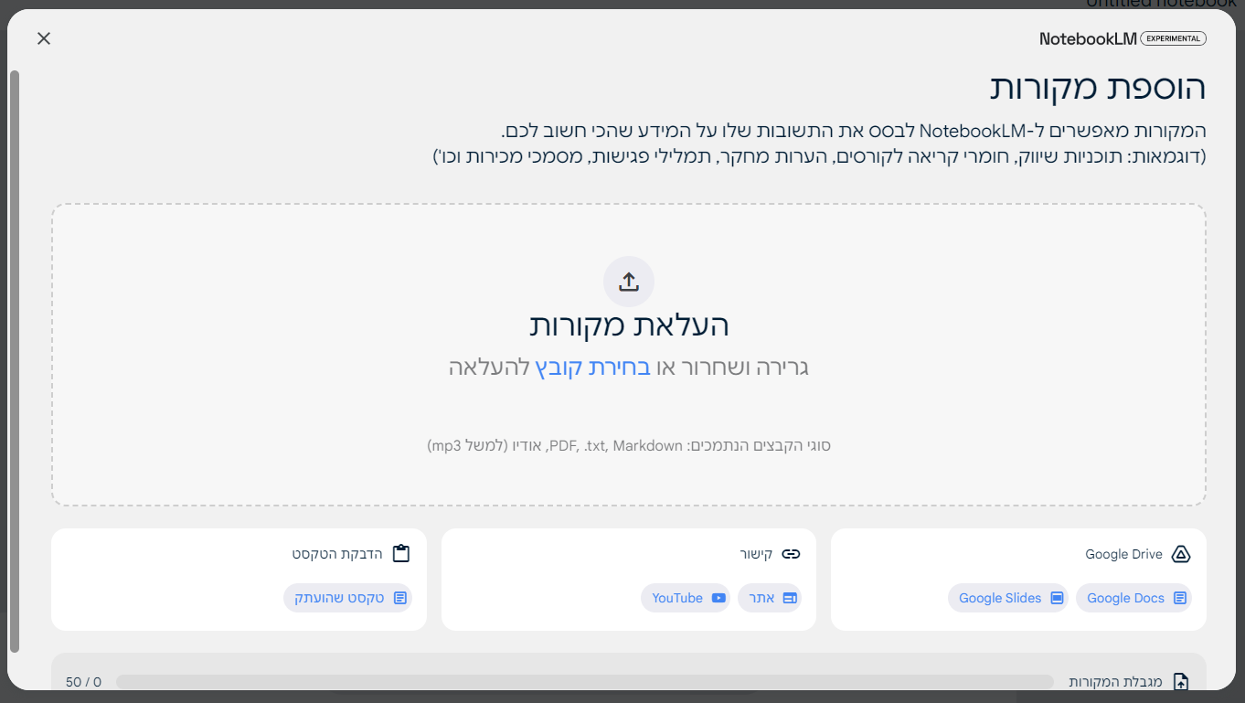 כשנלחץ על פתיחת נוטבוק חדש, ייפתח חלון שמזמין אותנו להעלות קבצים או קישורים שנרצה להתחיל לעבוד עליהם. נעלה את הספר שלנו בקובץ PDF. שימו לב שאפשר גם להתחבר ישירות לגוגל דרייב ולהעלות משם חומרים, להוסיף קישורים או אפילו להדביק טקסט. אפשר להעלות לכל נוטבוק כזה עד 50 מקורות (לא הכי רלוונטי לסופרות, אבל תכף אתייחס למי זה כן יכול לעזור):