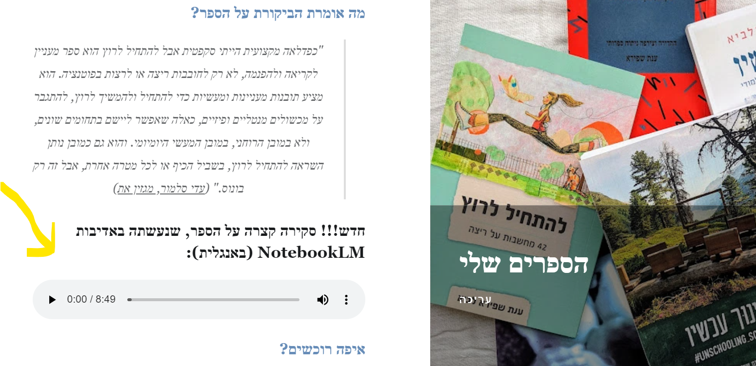 בסופו של תהליך, ככה למשל זה נראה עכשיו בדף מכירת הספרים שלי בבלוג. אחרי קטע מביקורת שפורסמה פעם על הספר במגזין את, שילבתי גם את הסקירה באנגלית של שני סוכני ה-AI של גוגל: