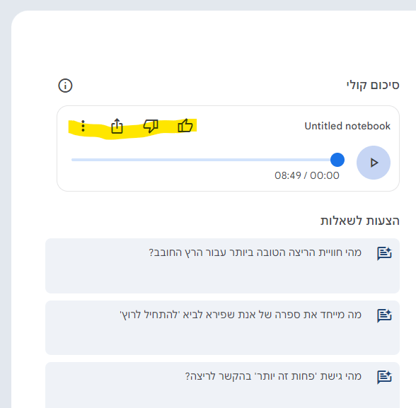 אחרי שהפודקאסט שלנו מוכן, נוכל לתת לנוטבוק פידבק לייק-דיסלייק אם אהבנו את התוצאה או לא (זה עוזר לכלי ללמוד ולהשתפר, תנו פידבק), או לקבל קישור שבאמצעותו נוכל לשתף את התוצר (הריבוע עם החץ למעלה):